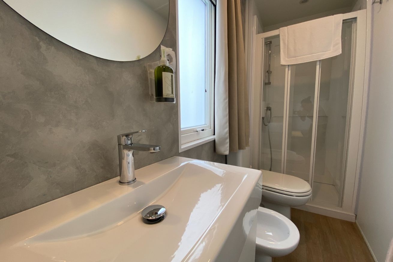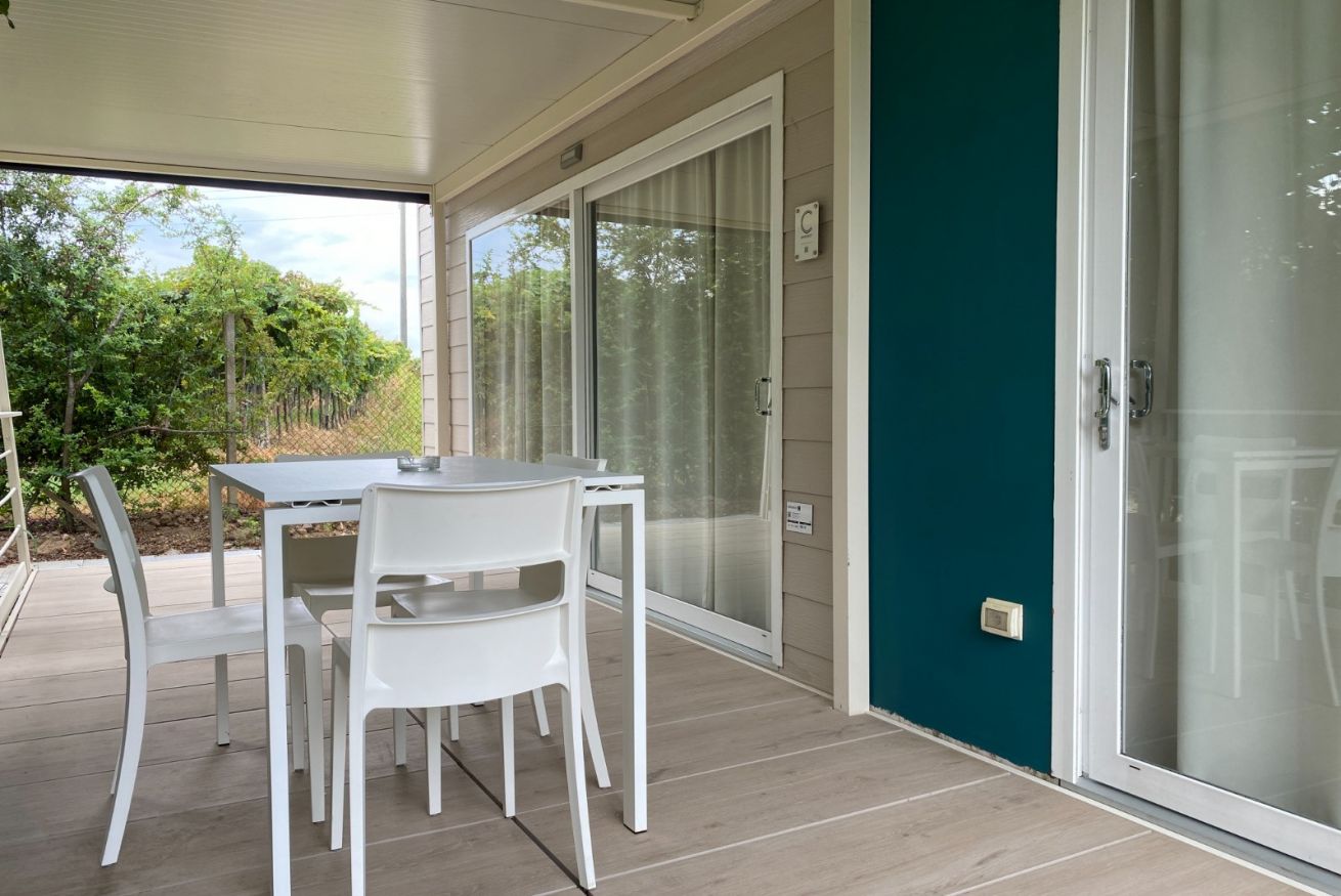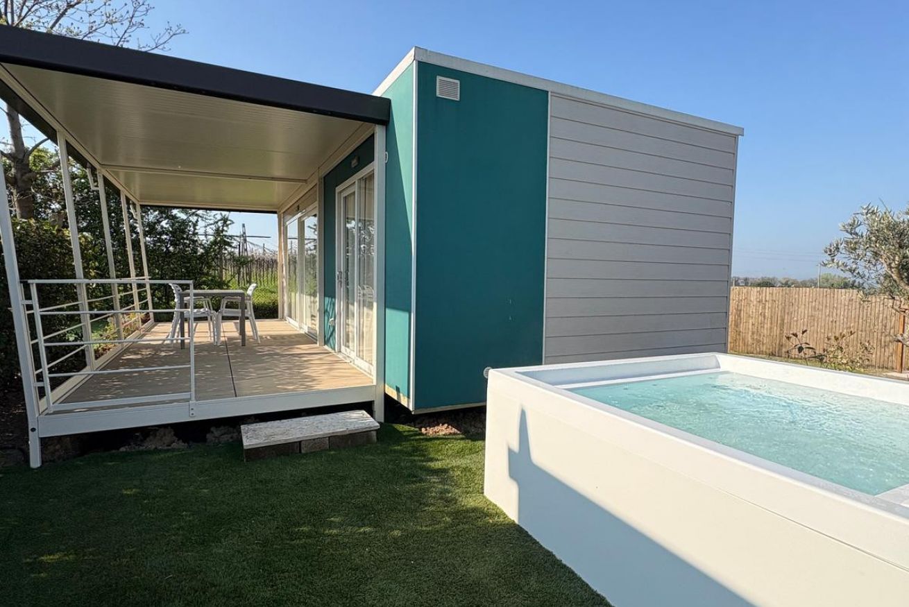 La casa mobile con giardino privato e vasca idromassaggio immersa nel verde del grande parco è ubicata in un piccolo contesto agricolo. E' un'abitazionie a marchio made in Italy con ingresso e parcheggio privato per garantire il massimo della privacy.