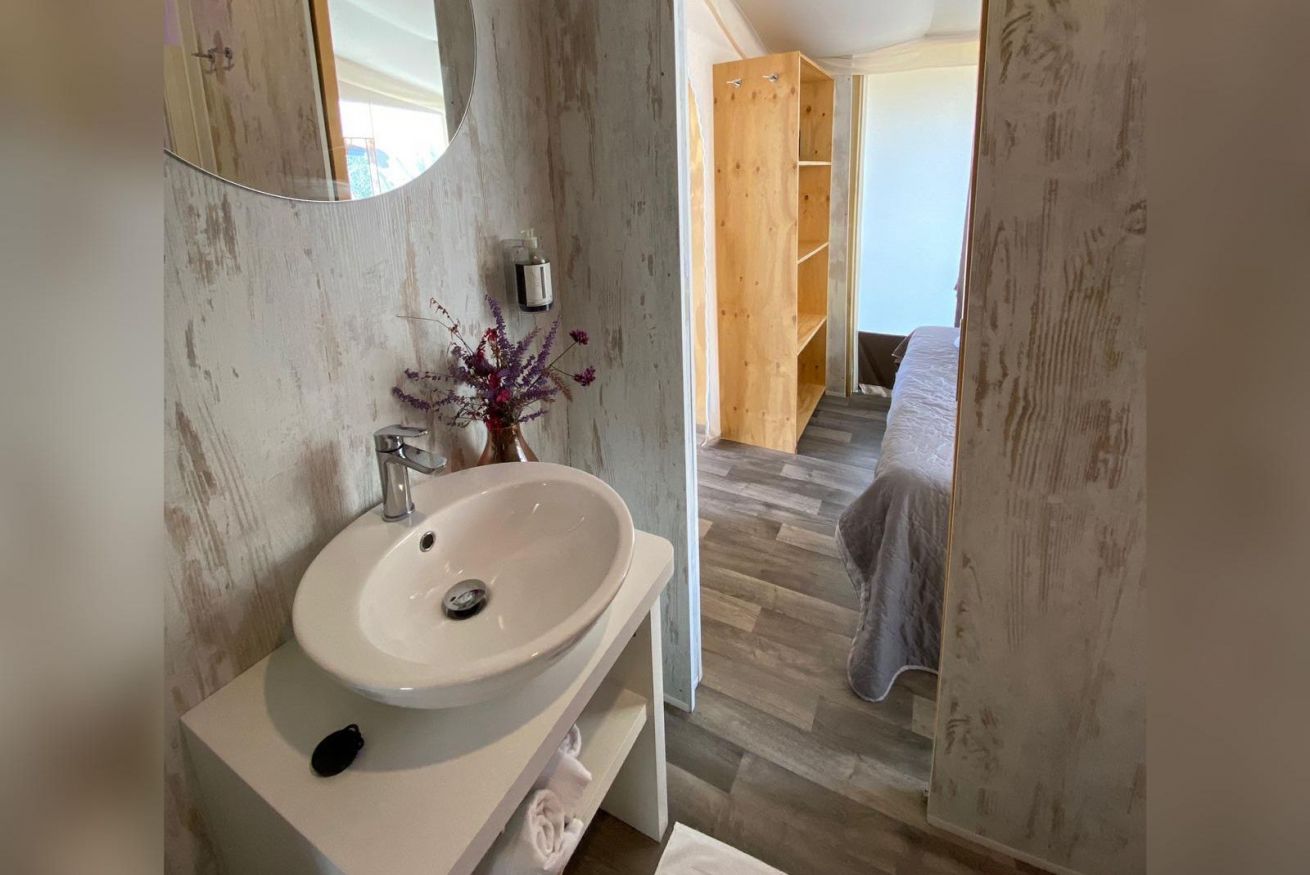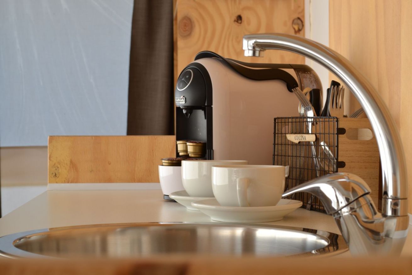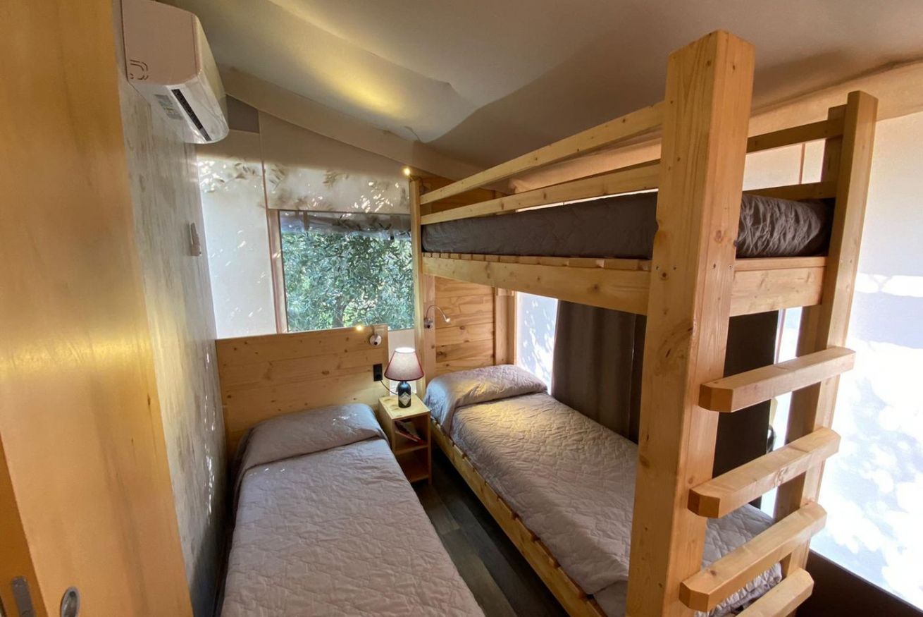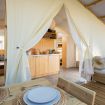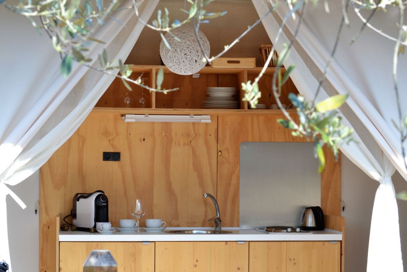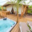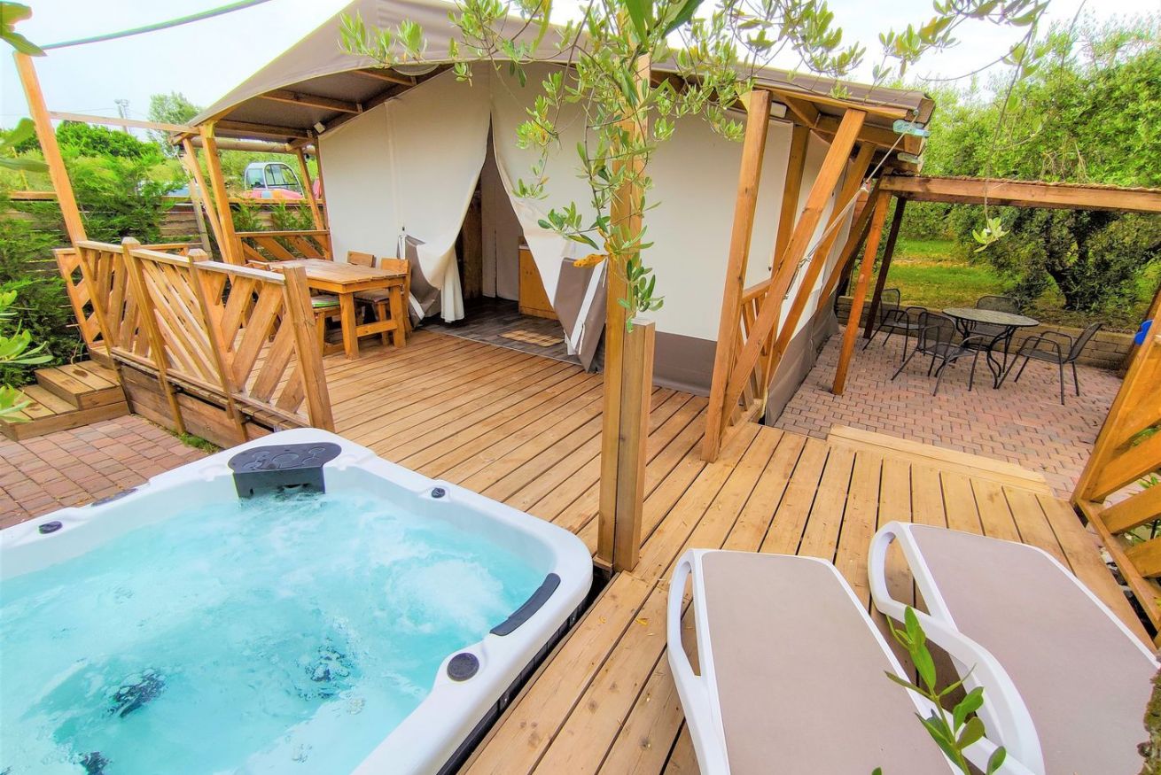 La tenda Glamping con vasca idromassaggio privata ad acqua riscaldata è immersa nel verde degli ulivi, in un contesto agricolo di poche unità. Si tratta di una struttura in legno rialzata da terra, simile ad una palafitta, composta da pareti di stoffa resistenti. È un alloggio che si presta ad una vacanza tutta open air, per vivere a pieno un'esperienza nella natura. Ingresso e parcheggio privato per garantire il massimo della privacy.